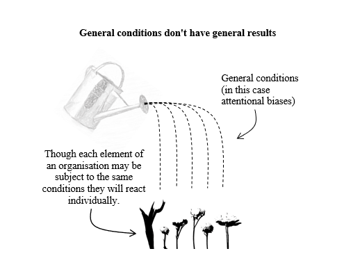 The transformative development of organisations requires evaluation and attention. This activity is polluted by multiple forms of biases that ultimately conspire to create a distance between that which should be worked on and that which is. This is a form of suboptimal change and different elements of organisations are subjected to this distance more than others to the extent to which organisational components are variously sensitive and susceptible to bias.
